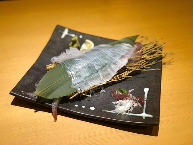 イカの王様と呼ばれるほどの高級な剣先イカを生きたまま、たらふく亭のイケスで泳がし最高の鮮度でお客様にご提供しています。日本一美味いと称される剣先イカは甘味が強く、活きイカならではの弾力と食感があります。鐘崎漁港で釣りあげられたイカの中でも厳選されたイカを使用しておりますので、他のイカとは違った味をお楽しみいただけること間違いなしです。
